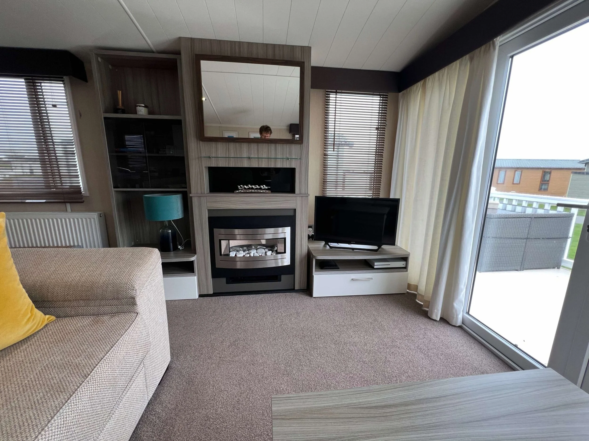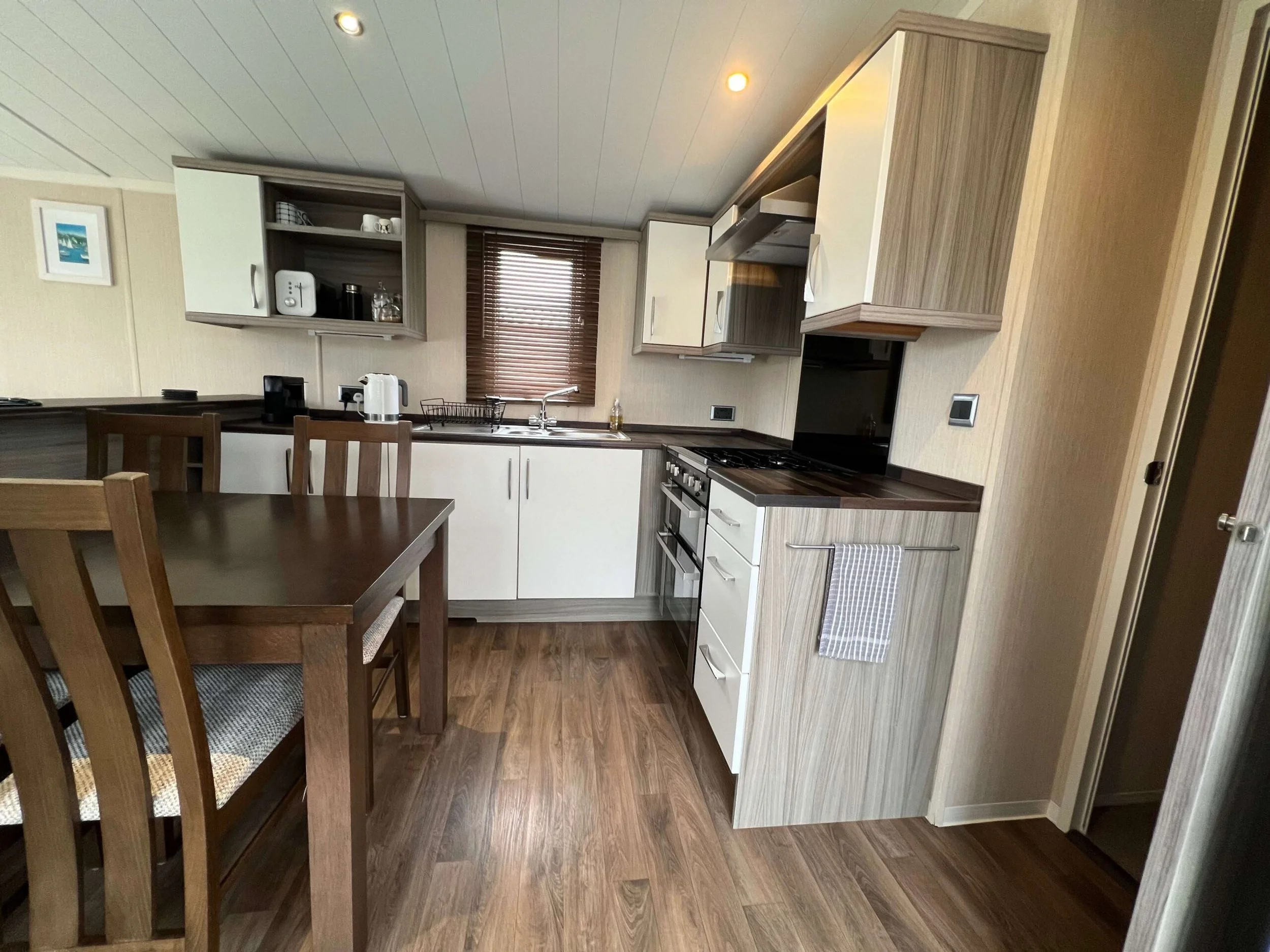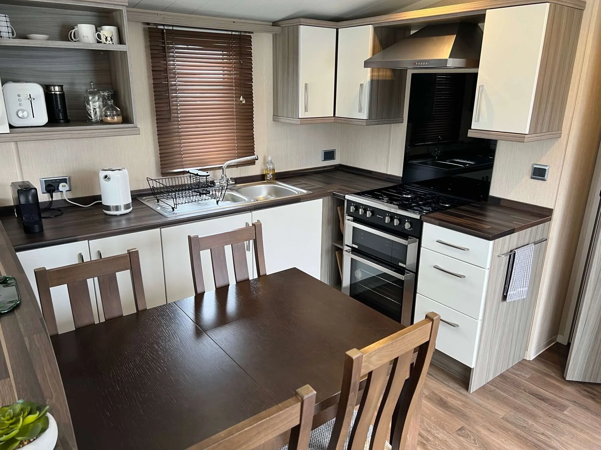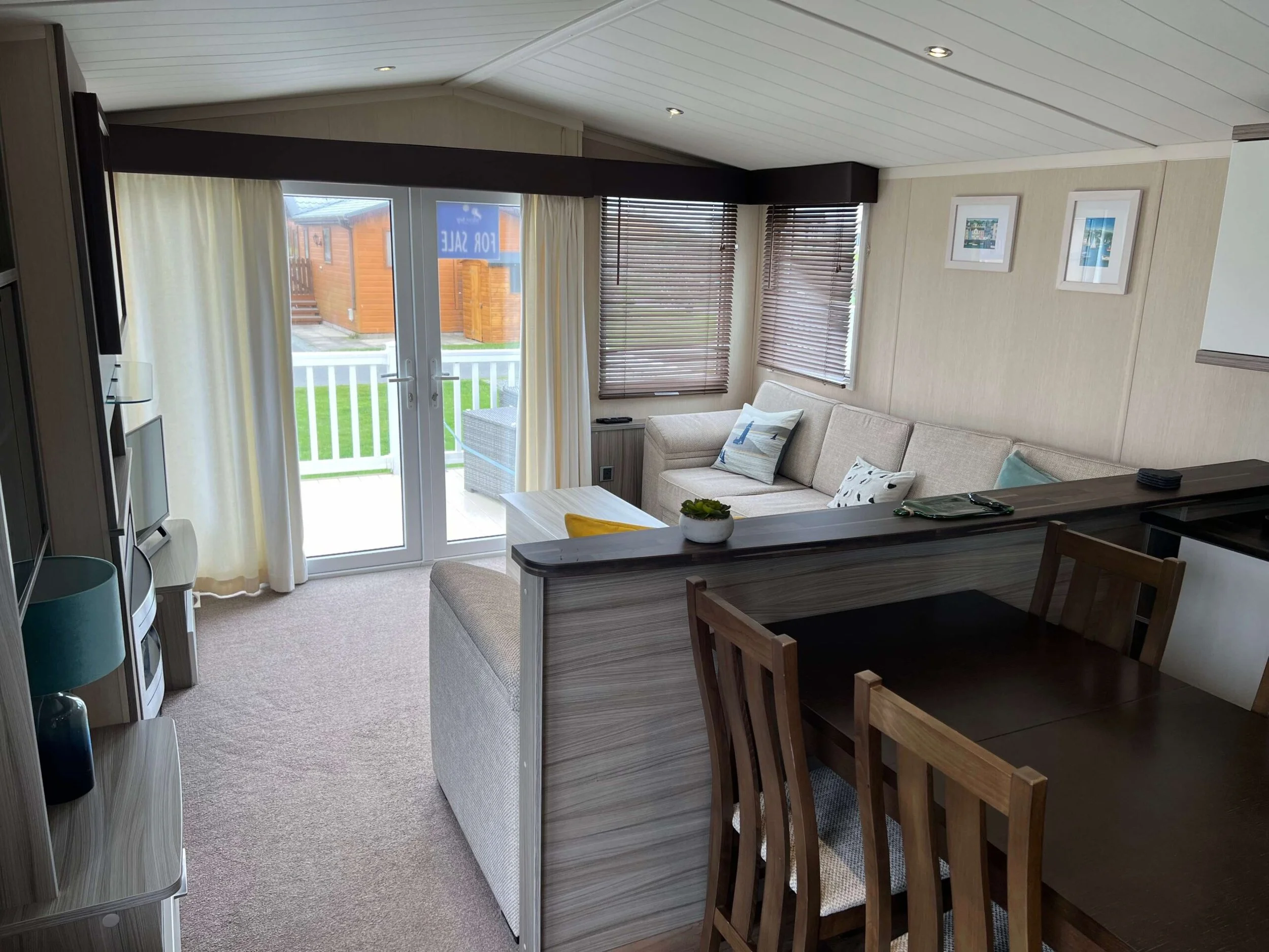 Inside, the open-plan living space is bright and welcoming, with large windows, patio doors, and a wraparound sofa for easy mornings or cosy nights in. The fully fitted kitchen includes integrated appliances and a freestanding dining table — just right for home-cooked meals or evening chats over a bottle of wine.