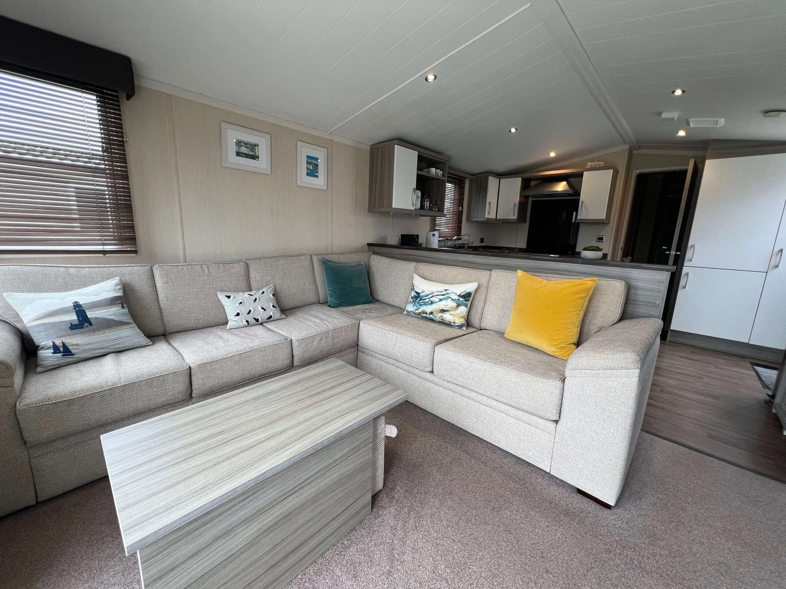 Inside, the open-plan living space is bright and welcoming, with large windows, patio doors, and a wraparound sofa for easy mornings or cosy nights in.