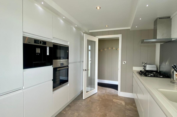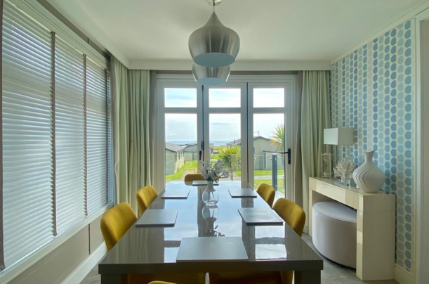 The kitchen is sleek and fully fitted with integrated appliances and plenty of room for gathering around the dining table. The living area is warm and welcoming, complete with a corner sofa and entertainment space — ideal for slow mornings or cosy evenings.