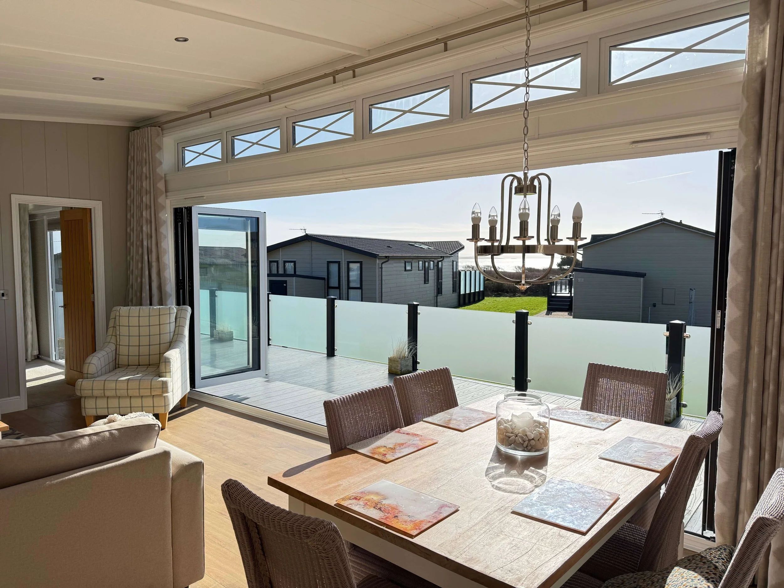 While the manufacturing is second to none, the same can also be said for the interior styling too with the lodge featuring a clean and modern aesthetic along with a range of quality furnishings. This also goes for the kitchen with its white shaker style aesthetic which is mixed with high-end practicality on account of the wide range of integrated appliances it offers. You’ll have everything that you need for self-catering here, with meals then able to be taken on the large six seater dining table or on your outdoor decking space which offers exceptional sea views and outdoor dining furniture.