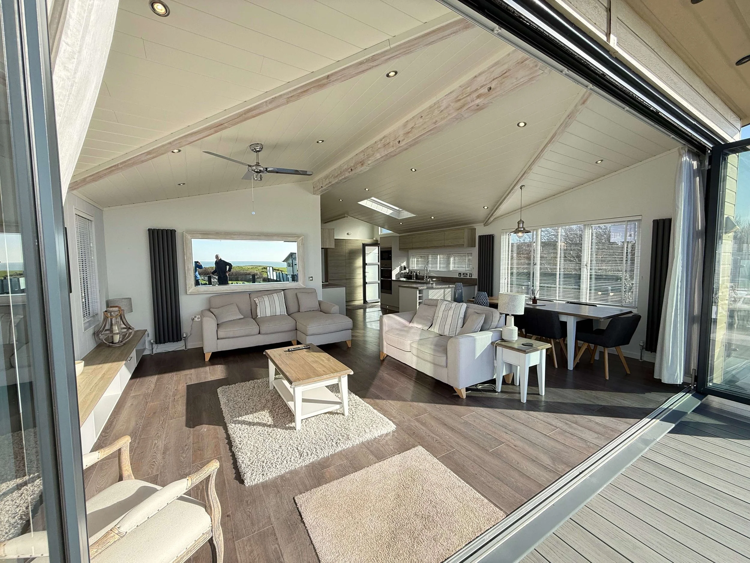 Sleeps up to seven, with generous living space, quality oak finishes, and doors that open the whole place up to light.